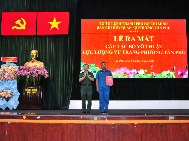 (QK7 Online) - Chiều 29/9, Ban CHQS phường Tân Phú, Thành phố Hồ Chí Minh tổ chức ra mắt Câu lạc bộ võ thuật lực lượng vũ trang phường. Tham dự có Thiếu tướng, Võ sư Vũ Văn Điền, Tư lệnh Bộ Tư lệnh Thành phố; Thiếu tướng Trần Văn Trai, Phó Tư lệnh Bộ Tư lệnh Thành phố; đồng chí Trần Văn Mỹ, Chủ tịch Liên đoàn Vovinam Việt Nam, Chánh trưởng quản môn phái Vovinam Việt Nam; đồng chí Lê Thị Kim Hồng, Bí thư Đảng ủy, Chủ tịch HĐND phường, 99Oke123 Tải ứng dụng viên Ban CHQS Phường Tân Phú; đồng chí Võ Trương Bình, Phó Bí thư Đảng ủy, Chủ tịch UBND phường Tân Phú.