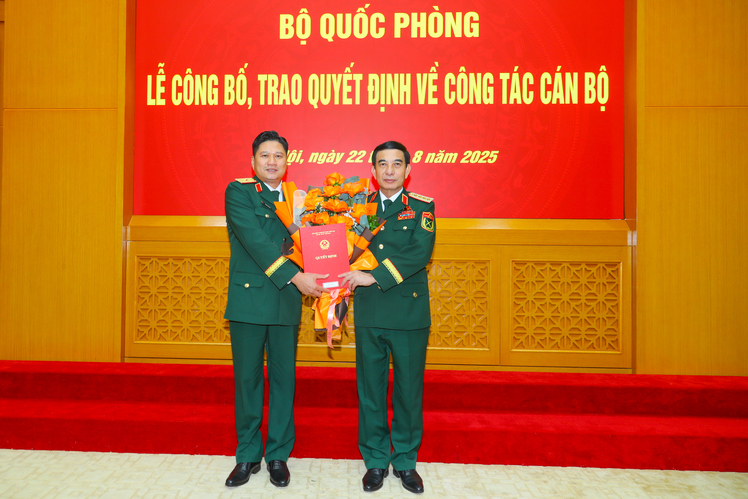 Đại tướng Phan Văn Giang trao Quyết định và tặng hoa chúc mừng Thiếu tướng Phan Quốc Việt, Phó Tư lệnh, Tham mưu trưởng Bộ Tư lệnh Thành phố Hồ Chí Minh.