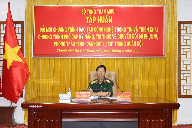 (QK7 Online) - Sáng 21/8, tại Học viện Kỹ thuật Quân sự, Bộ Tổng Tham mưu tổ chức khai mạc lớp tập huấn trực tuyến “Đổi mới chương trình đào tạo công nghệ thông tin và triển khai chương trình phổ cập kỹ năng, tri thức về chuyển đổi số phục vụ phong trào “Bình dân học vụ số” trong Quân đội”. Lớp tập huấn được kết nối trực tuyến với 30 điểm cầu của các đơn vị, học viện, nhà trường trong toàn quân.