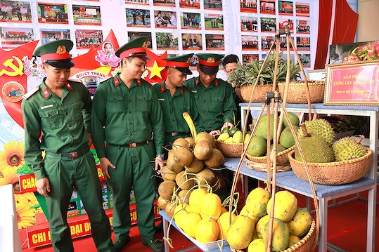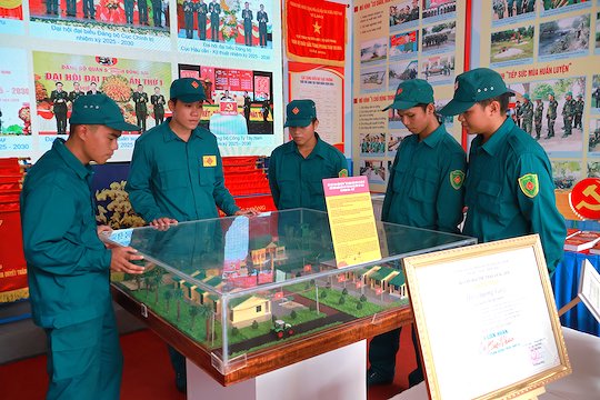 Chiến sĩ Dân quân tự vệ tham quan mô hình kết quả thực hiện đề án "Xây dựng điểm dân cư liền kề chốt dân quân biên giới trên địa bàn tỉnh Tây Ninh giai đoạn 2019 - 2025".