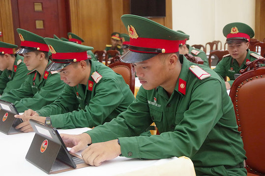 Chiến sĩ Lữ đoàn 23 tham quan, trải nghiệm các thiết bị phục vụ cho "Đại hội không giấy".