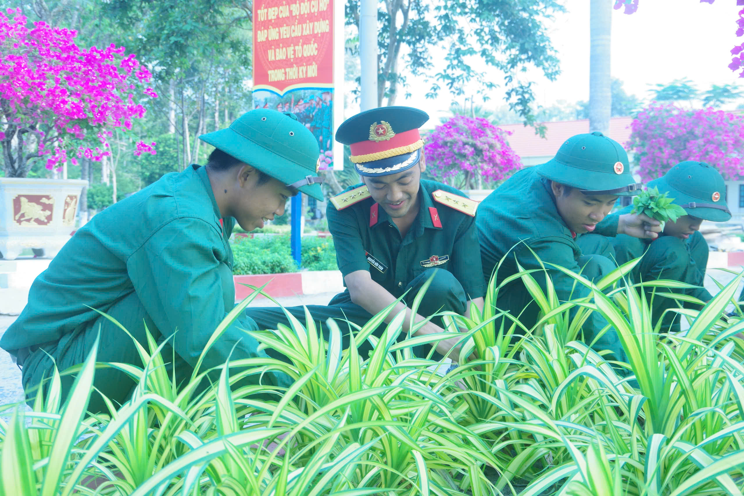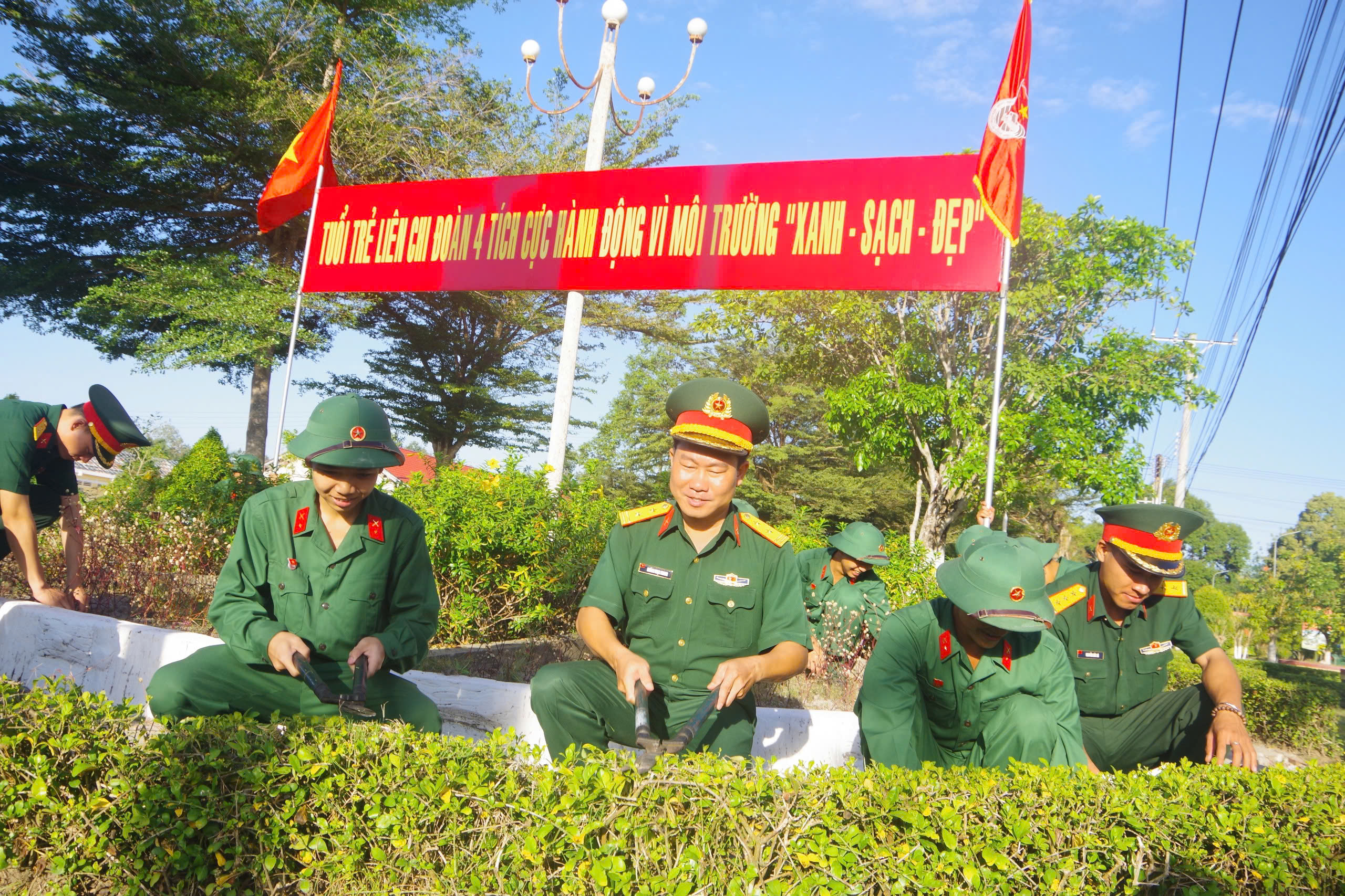 Tổ cắt tỉa bồn hoa, cây cảnh của Chi đoàn Đại đội 10, Liên Chi đoàn 6, Đoàn Cơ sở Trung đoàn 5 đang chăm chỉ làm đẹp khuôn viên đơn vị.