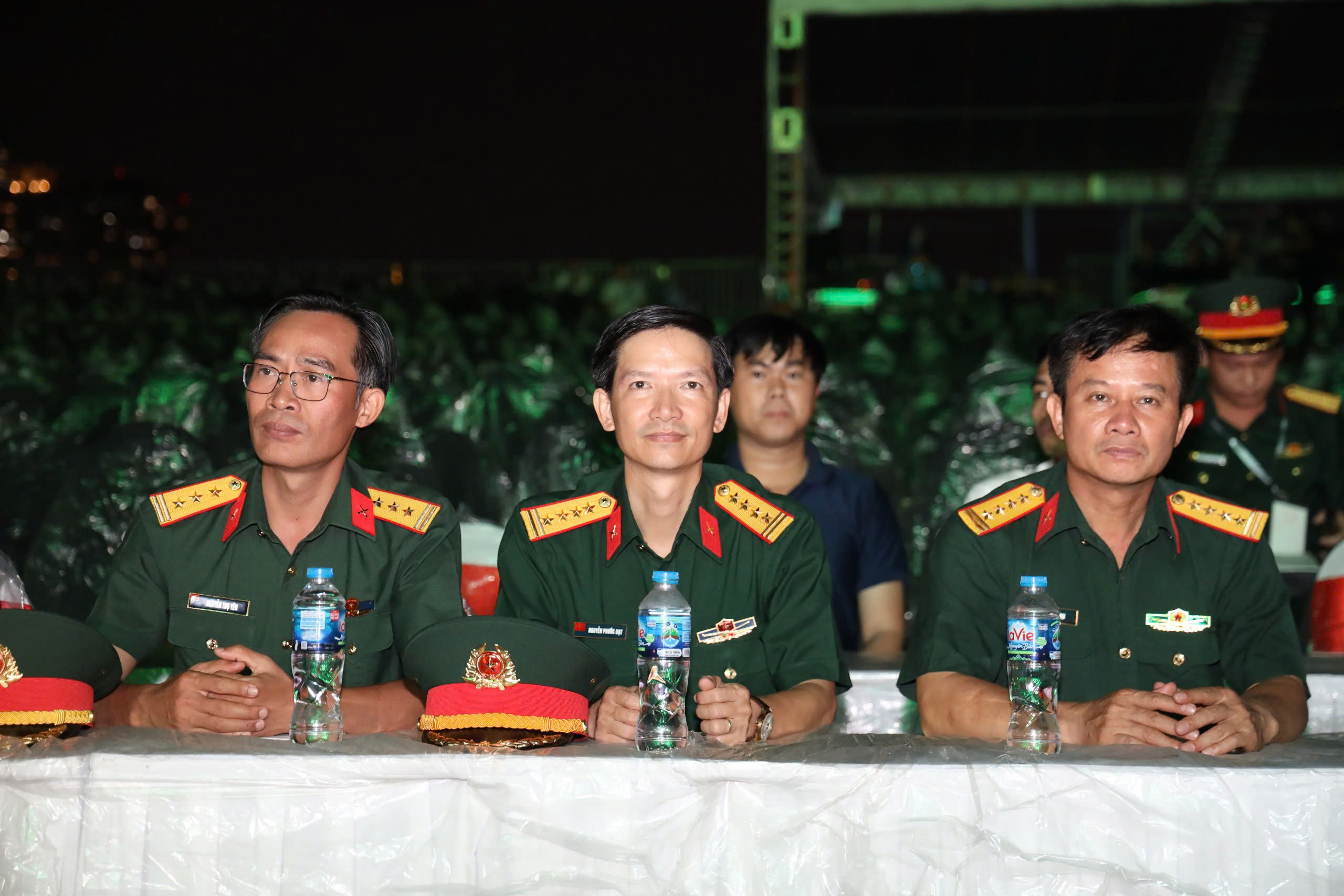 Từ phải vào: Thiếu tướng Nguyễn Xuân Thủy, Phó Cục trưởng Cục Tuyên huấn; Thiếu tướng Trần Chí Tâm, Phó Chính ủy Quân khu 7; Đại tá Trần Đức Thắng, Bí thư Đảng ủy Cục Chính trị, Phó Chủ nhiệm Chính trị Quân khu 7 dự buổi tổng duyệt.