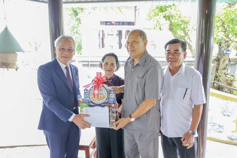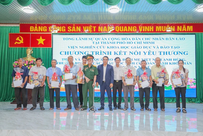 Ông Mai Như Trinh, Phó Viện trưởng Viện Nghiên cứu Khoa học Giáo dục và Đào tạo tặng quà các gia đình chính sách và cựu chiến binh.