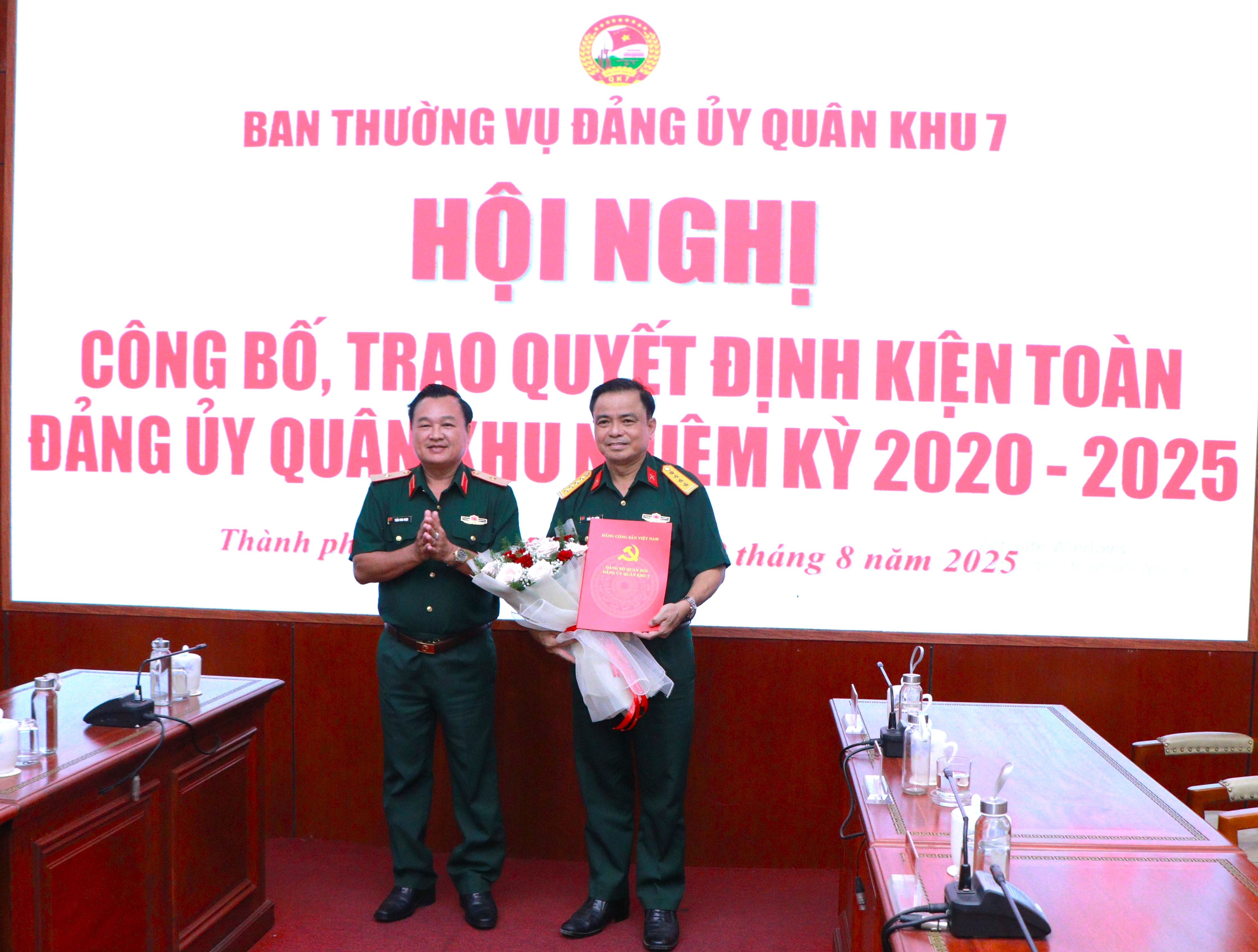 (QK7 Online) - Sáng 8/8, Ban Thường vụ Đảng ủy Quân khu 7 tổ chức hội nghị công bố, trao quyết định của Ban Thường vụ Quân ủy Trung ương về kiện toàn Đảng ủy Quân khu nhiệm kỳ 2020 - 2025. Thiếu tướng Trần Vinh Ngọc, Bí thư Đảng ủy, Chính ủy Quân khu chủ trì trao quyết định.