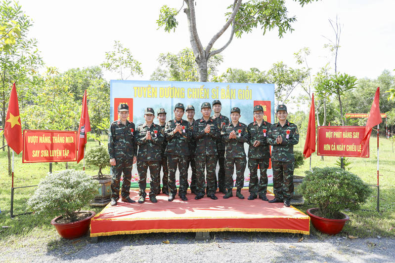 Đại tá Trần Văn Long chúc mừng các đồng chí đạt "Hoa bắn giỏi"