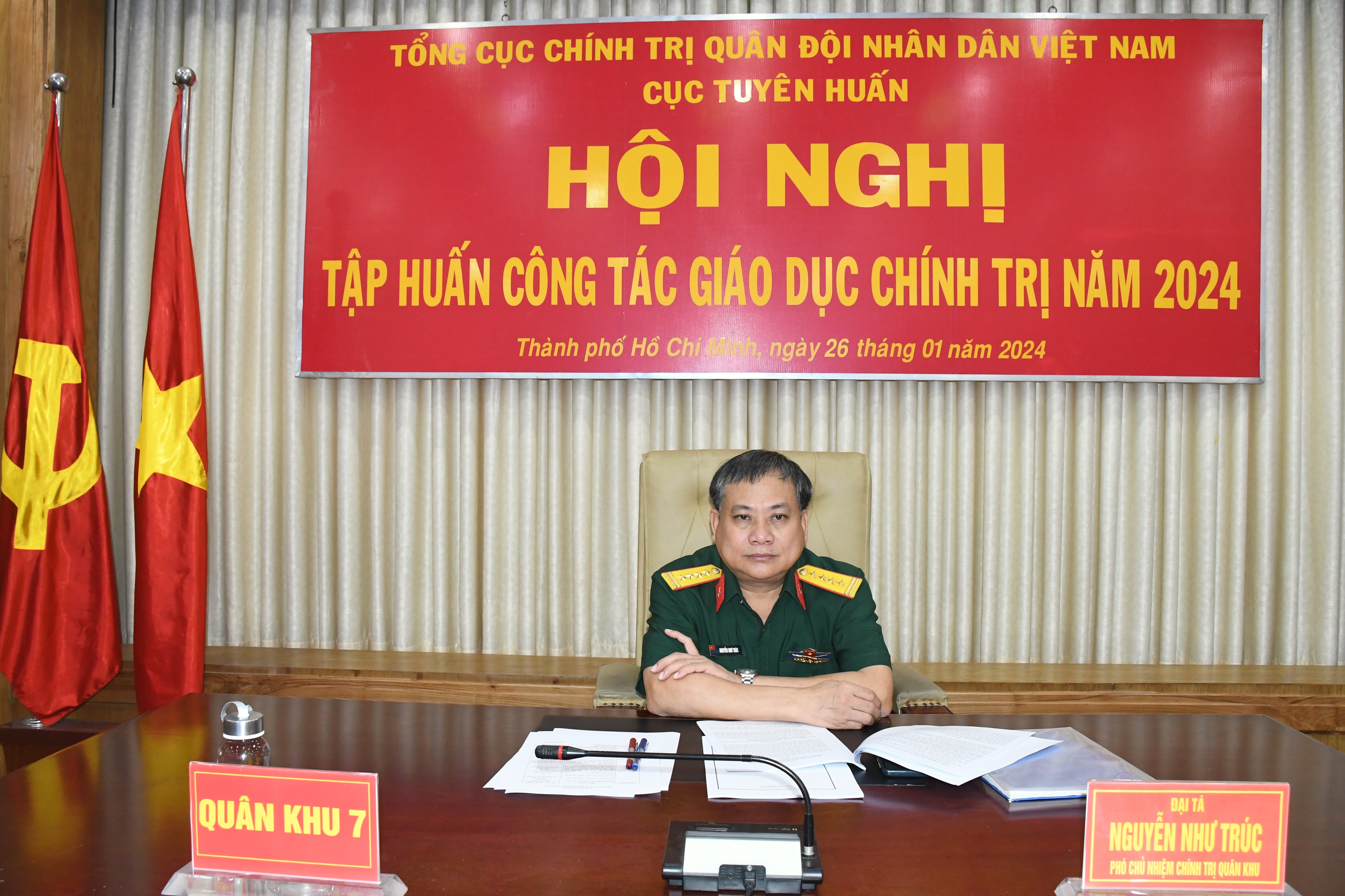 (QK7 Online) - Sáng ngày 26-1, Cục Tuyên huấn (Tổng cục Chính trị QĐND Việt Nam) tổ chức Hội nghị tập huấn công tác giáo dục chính trị (GDCT) năm 2024 theo hình thức trực tuyến. Thiếu Tướng Đỗ Thanh Phong, Phó Cục trưởng Cục Tuyên huấn chủ trì Hội nghị. Đại tá Nguyễn Như Trúc, Phó Chủ nhiệm Chính trị Quân khu chủ trì tại điểm cầu Quân khu 7.