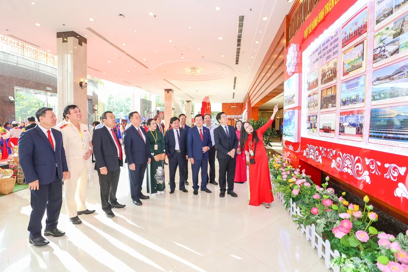 Lãnh đạo, nguyên lãnh đạo Đảng, Nhà nước và tỉnh Tây Ninh tham quan các gian hàng trưng bày sản phẩm OCOP, công nghệ số và hình ảnh thành tựu kinh tế - xã hội tỉnh Tây Ninh.