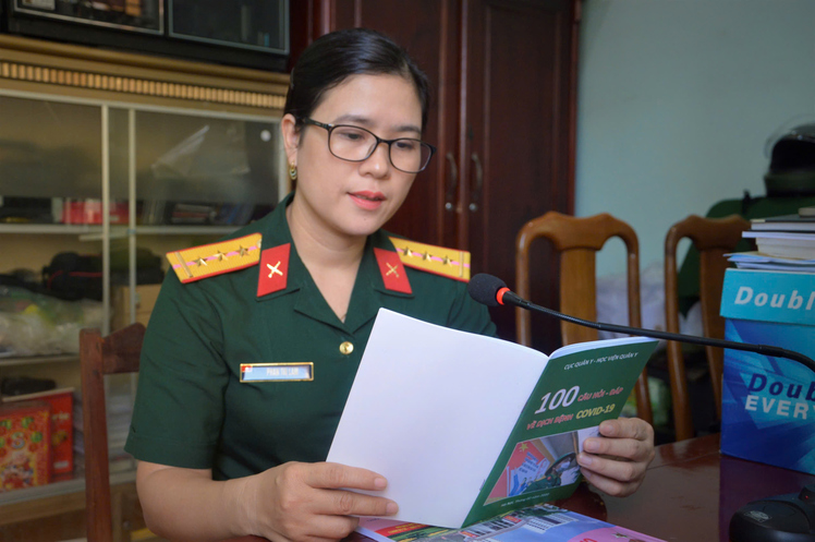 Đại úy QNCN Phan Thị Lam thực hiện chương trình phát thanh nội bộ tại đơn vị.