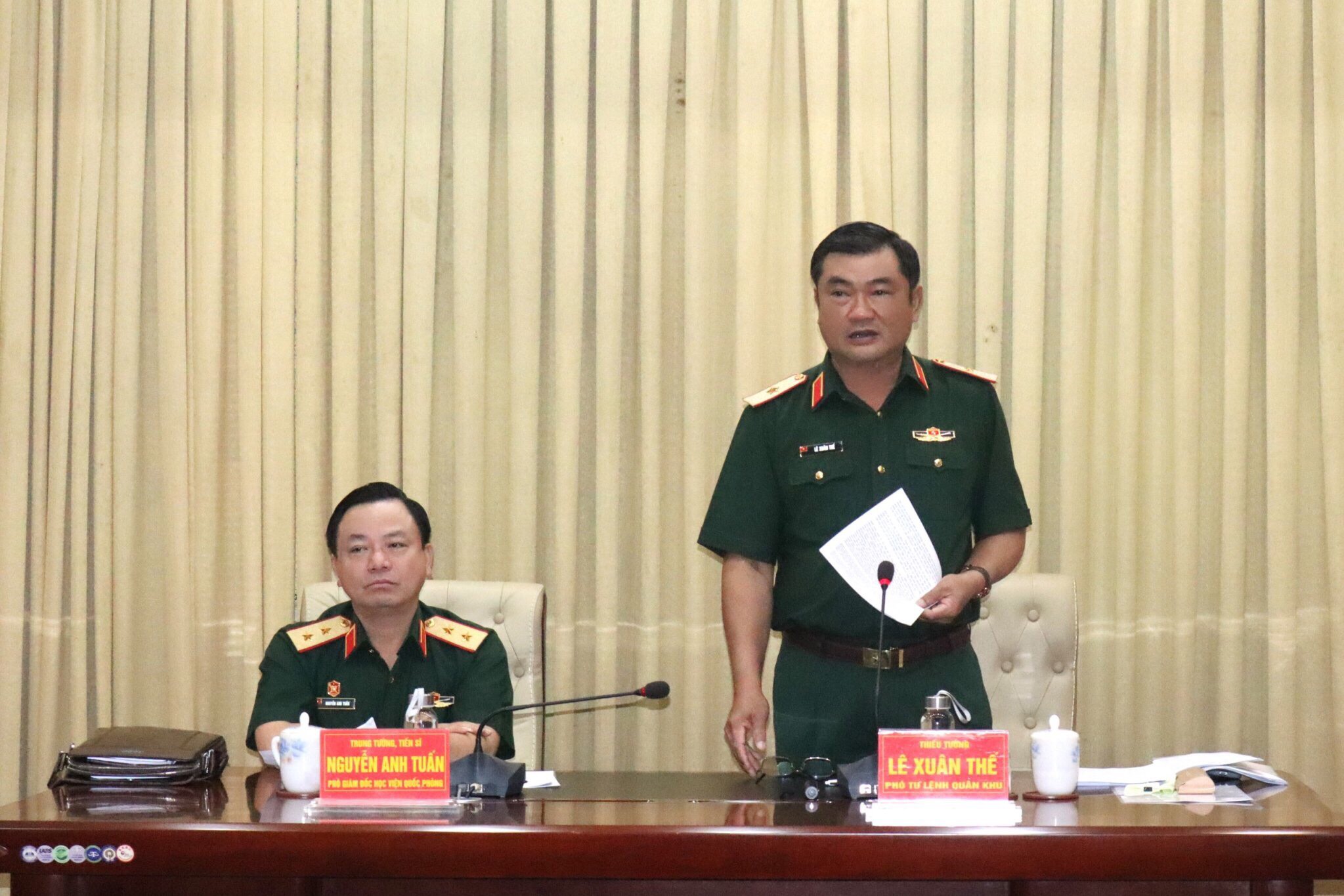 Trao đổi với đoàn công tác, Thiếu tướng Lê Xuân Thế, Phó Tư lệnh Quân khu cung cấp một số nét chính về đặc điểm, tình hình địa bàn, nhiệm vụ của LLVT Quân khu; kết quả phát triển kinh tế, xã hội và quốc phòng - an ninh, đối ngoại, xây dựng, hoạt động khu vực phòng thủ trên địa bàn Quân khu trong thời gian qua.