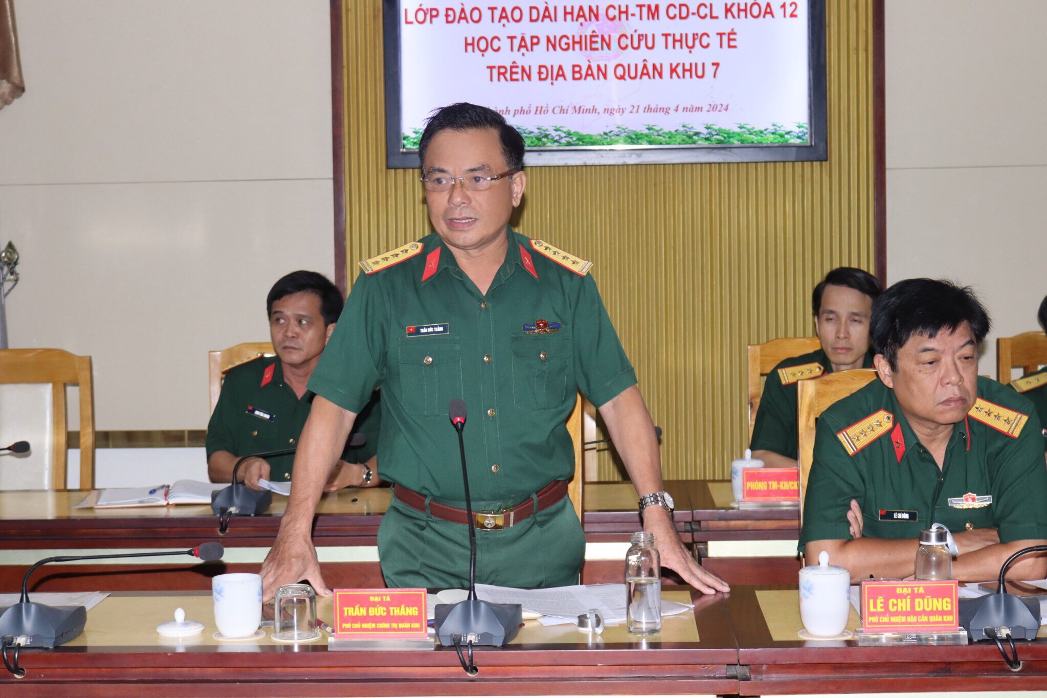 Đại tá Trần Đức Thắng, Phó Chủ nhiệm Chính trị quân khu phát biểu tại buổi làm việc.
