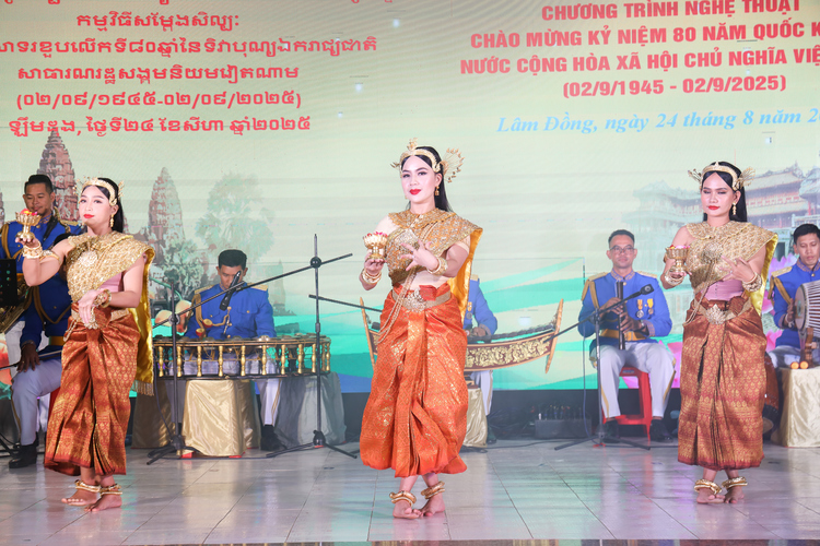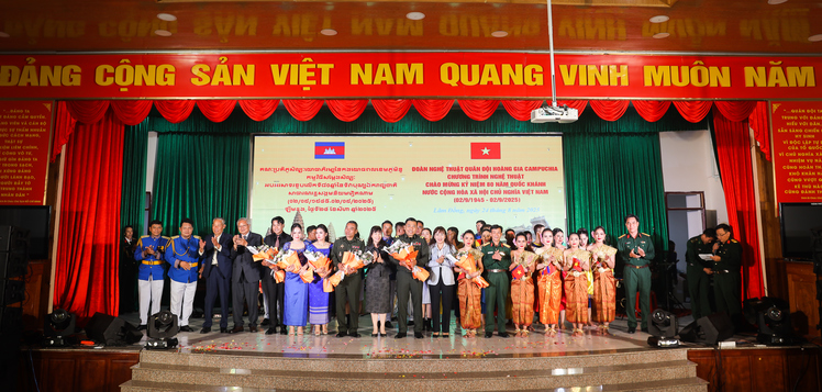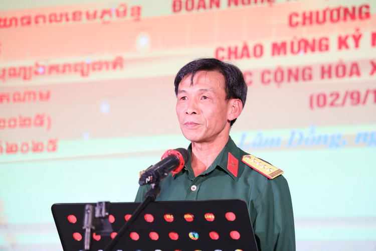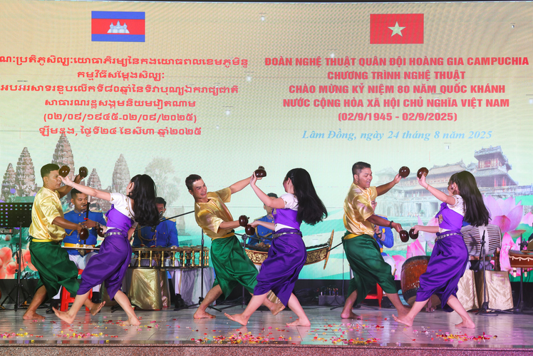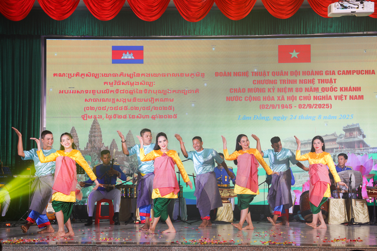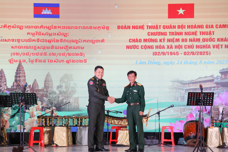 (QK7 Online) - Tối 24/8, tại Bộ CHQS tỉnh Lâm Đồng đã diễn ra chương trình giao lưu và biểu diễn nghệ thuật “Thắm tình hữu nghị Việt Nam - Campuchia” do Đoàn Nghệ thuật Quân đội Hoàng gia Campuchia biểu diễn. Chương trình được thực hiện nhằm chào mừng kỷ niệm 80 năm Quốc khánh nước Cộng hòa xã hội chủ nghĩa Việt Nam (2/9/1945 – 2/9/2025).