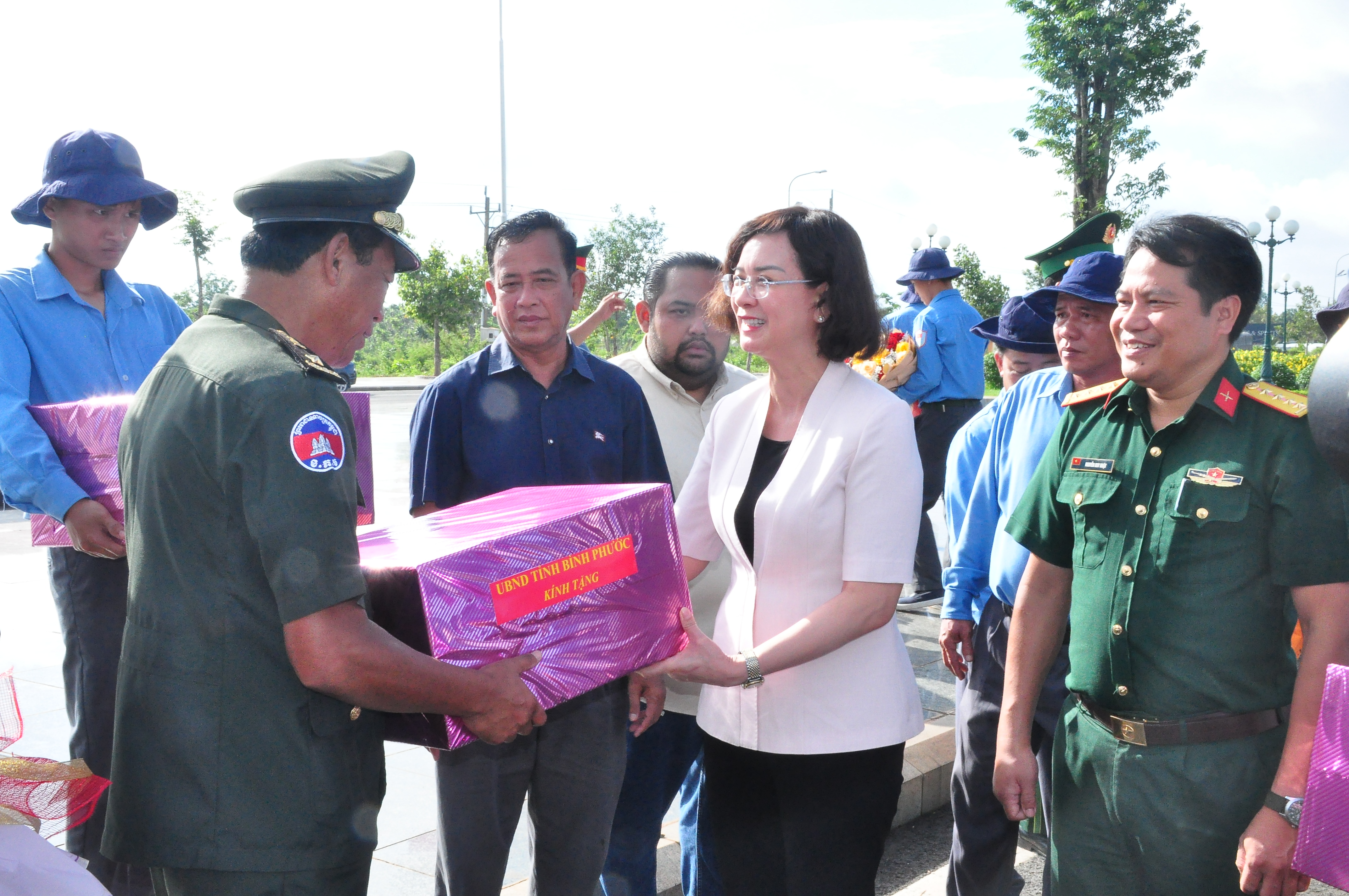 Đồng chí Trần Tuyết Minh tặng quà cảm ơn lực lượng nước bạn đã hỗ trợ, giúp đỡ Đội K72 hoàn thành nhiệm vụ.