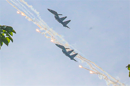 Máy bay Su 30MK2 luyện tập trình diễn thả bẫy nhiệt chuẩn bị cho đại lễ 50 năm Ngày giải phóng miền Nam, thống nhất đất nước. Ảnh: Lê Tiến