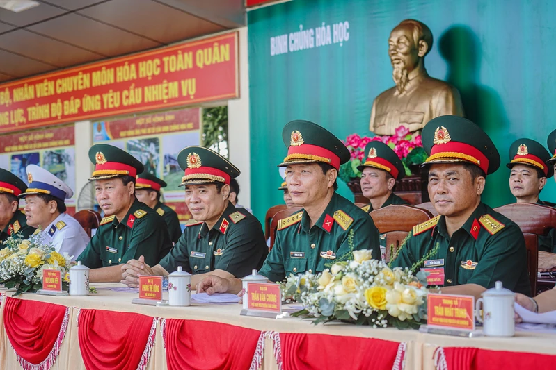 Thiếu tướng Thiếu tướng Nguyễn Đình Hiền, Tư lệnh Binh chủng Hóa học (thứ 3 từ phải) và Đại tá Phùng Thế Hùng, Phó Tham mưu trưởng Quân khu (thứ 2 từ phải) dự lễ khai mạc.