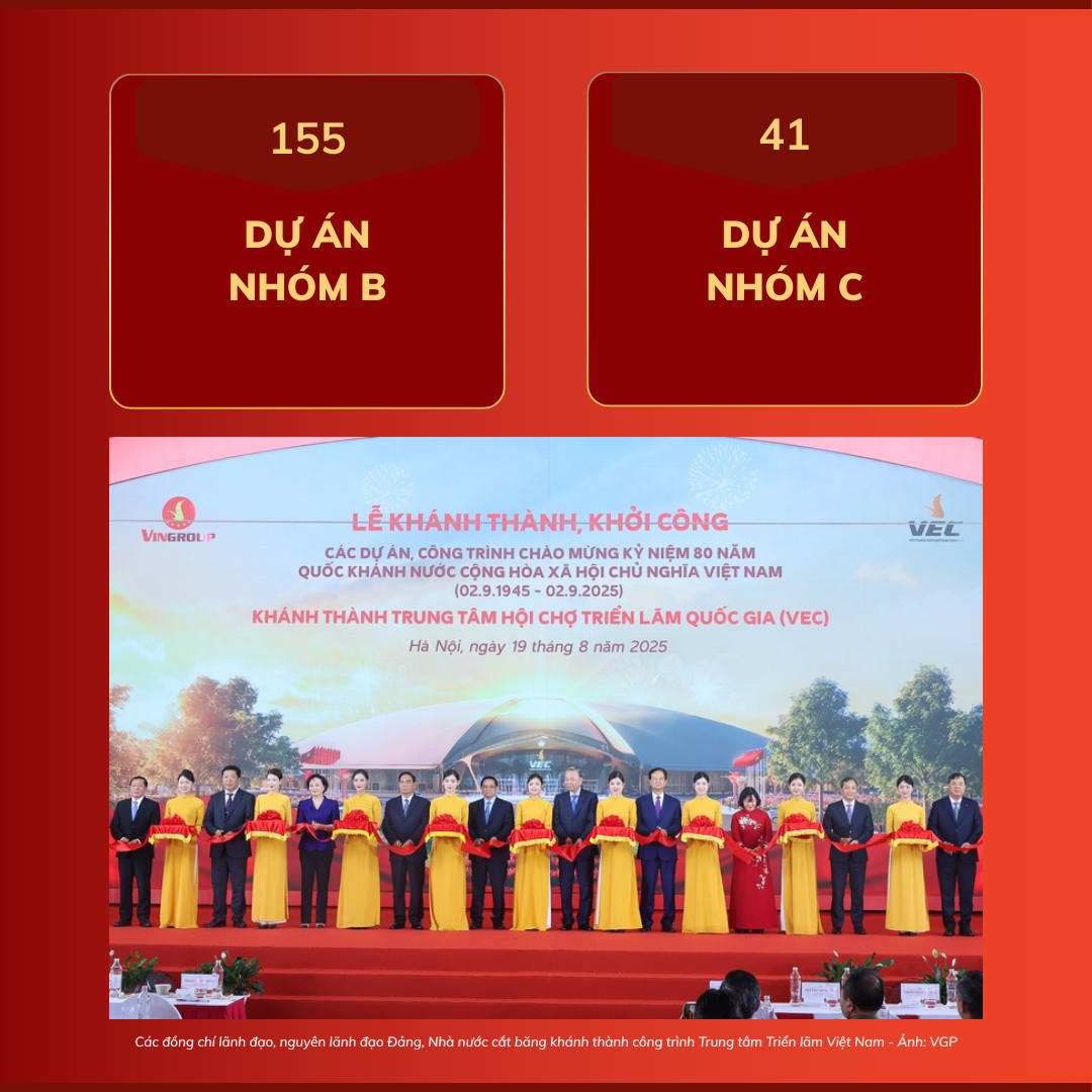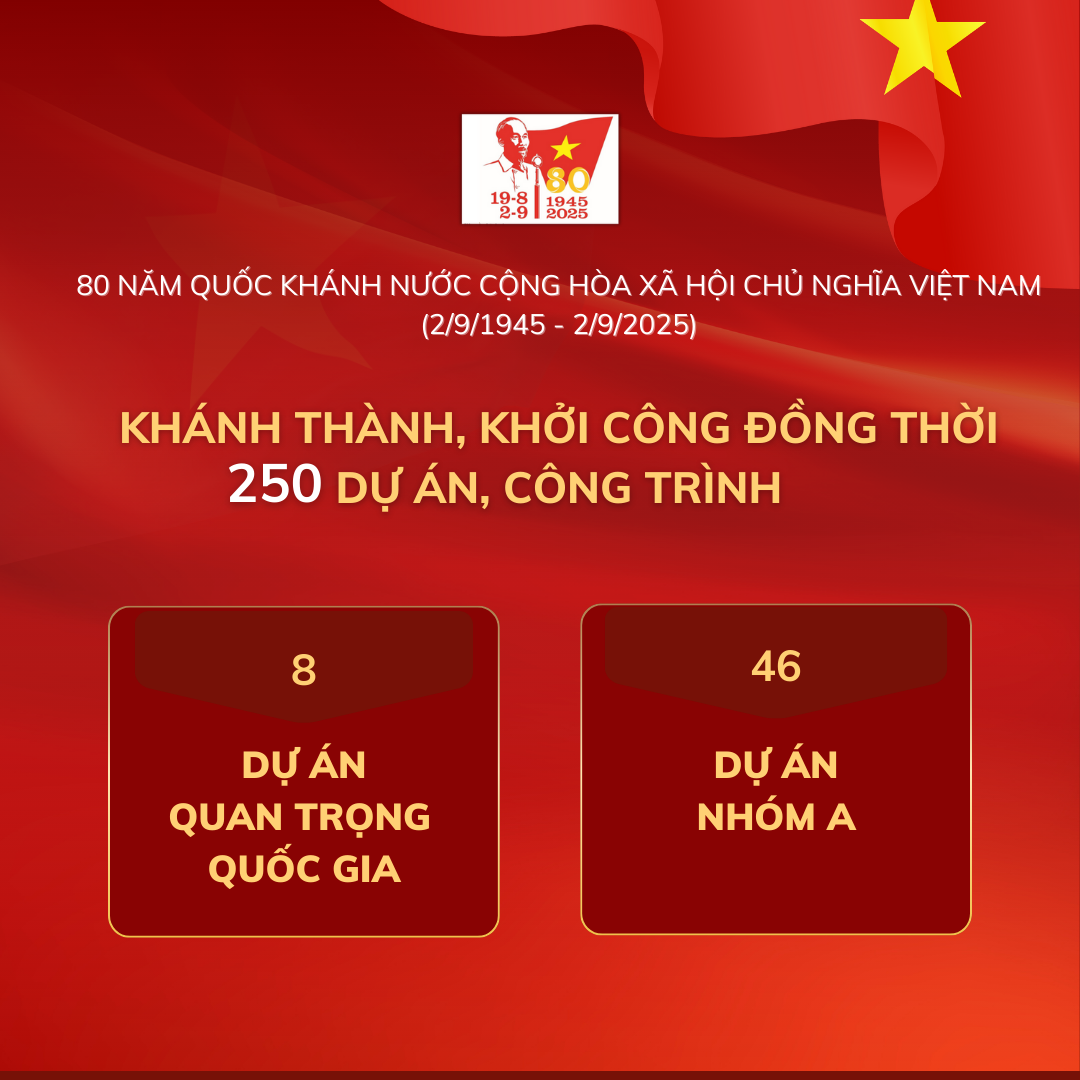 250 công trình, dự án với tổng vốn gần 1,3 triệu tỷ đồng sẽ được đồng loạt khánh thành, khởi công trên khắp cả nước vào sáng nay 19/8. Sự kiện nhằm chào mừng 80 năm Cách mạng tháng Tám và Quốc khánh 2/9.