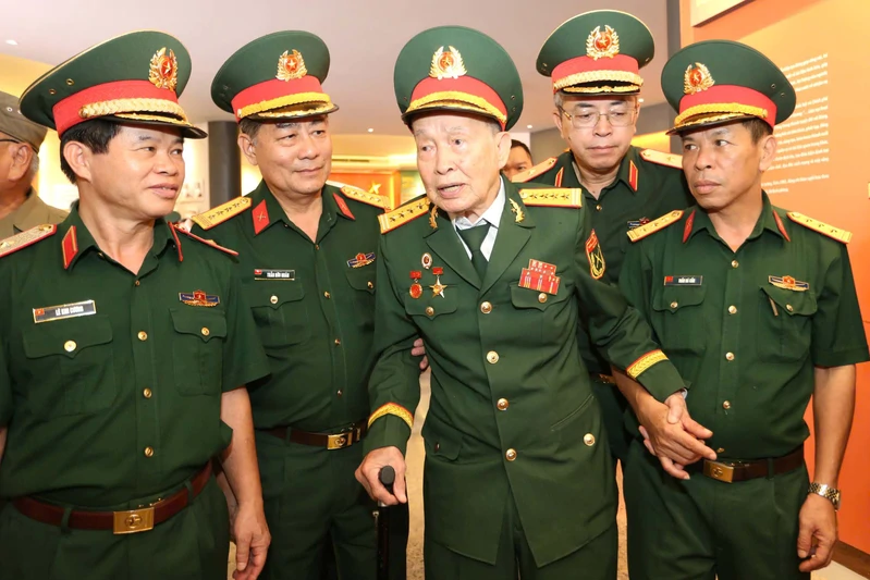 Đại biểu cùng Đại tá, AHLLVTND Nguyễn Văn Tàu tham quan triển lãm.