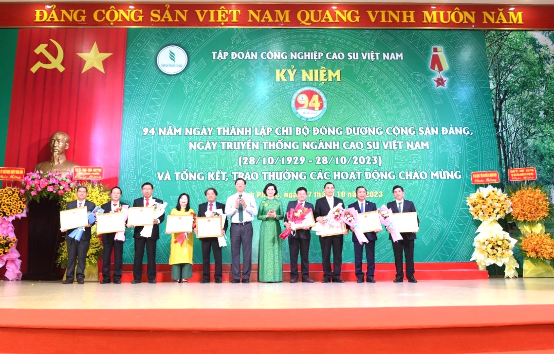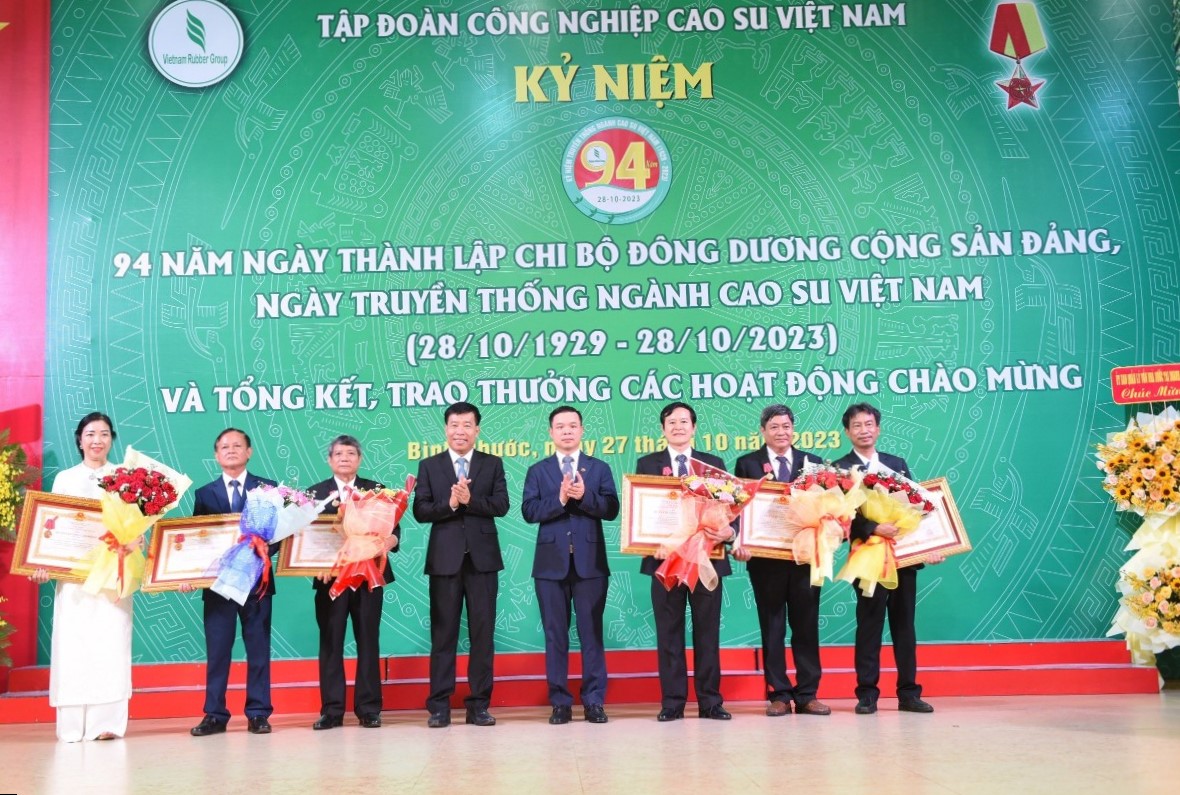 (QK7 Online) - Ngày 27/10, Tập đoàn công nghiệp Cao su Việt Nam tổ chức Lễ kỷ niệm 94 năm Ngày thành lập Chi bộ Đông Dương Cộng sản Đảng và Ngày truyền thống Ngành Cao su Việt Nam (28/10/1929 – 28/10/2023). Dự Lễ kỷ niệm có đồng chí Nguyễn Mạnh Cường, Ủy viên Ban chấp hành Trung ương Đảng, Bí thư Tỉnh ủy Bình Phước; đồng chí Trần Tuyết Minh, Phó Chủ tịch UBND tỉnh Bình Phước; đồng chí Đỗ Hữu Huy, Phó Chủ tịch Ủy ban quản lý vốn nhà nước tại doanh nghiệp; đại tá Nguyễn Như Trúc, Phó Chủ nhiệm Chính trị Quân khu 7; đại diện các sở, ban, ngành tỉnh Bình Phước; lãnh đạo Tập đoàn Công nghiệp Cao su Việt Nam.