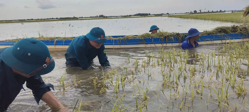 Lực lượng vũ trang tỉnh Tây Ninh giúp dân cứu lúa chạy lũ