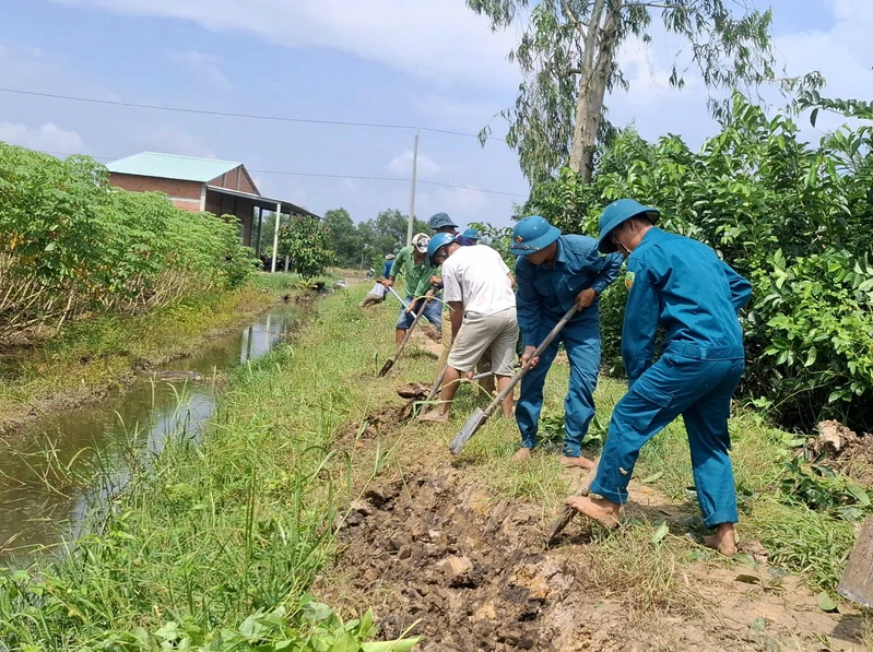 Dân quân xã Bình Thành cùng người dân nâng cao tuyến đê bao bảo vệ khu sản xuất.