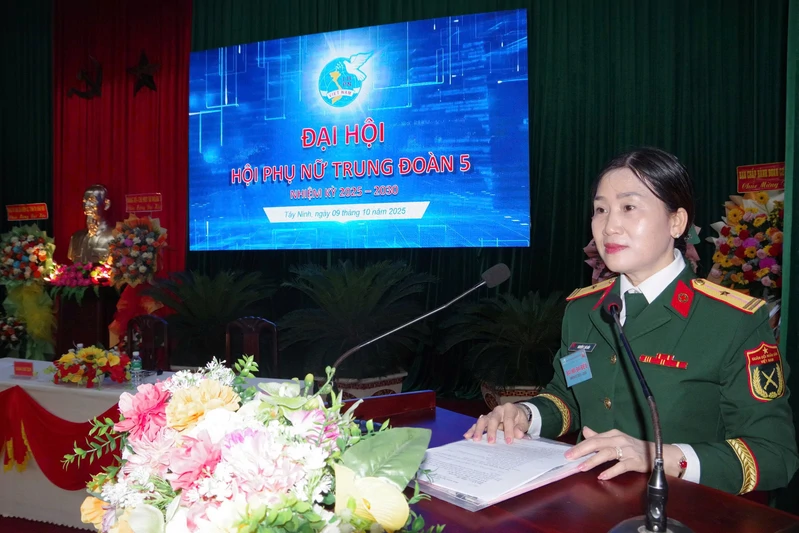 Thiếu tá QNCN Nguyễn Thị Hà Bản phát biểu tại Đại hội Phụ nữ Trung đoàn 5, Sư đoàn 5 nhiệm kỳ 2025 - 2030