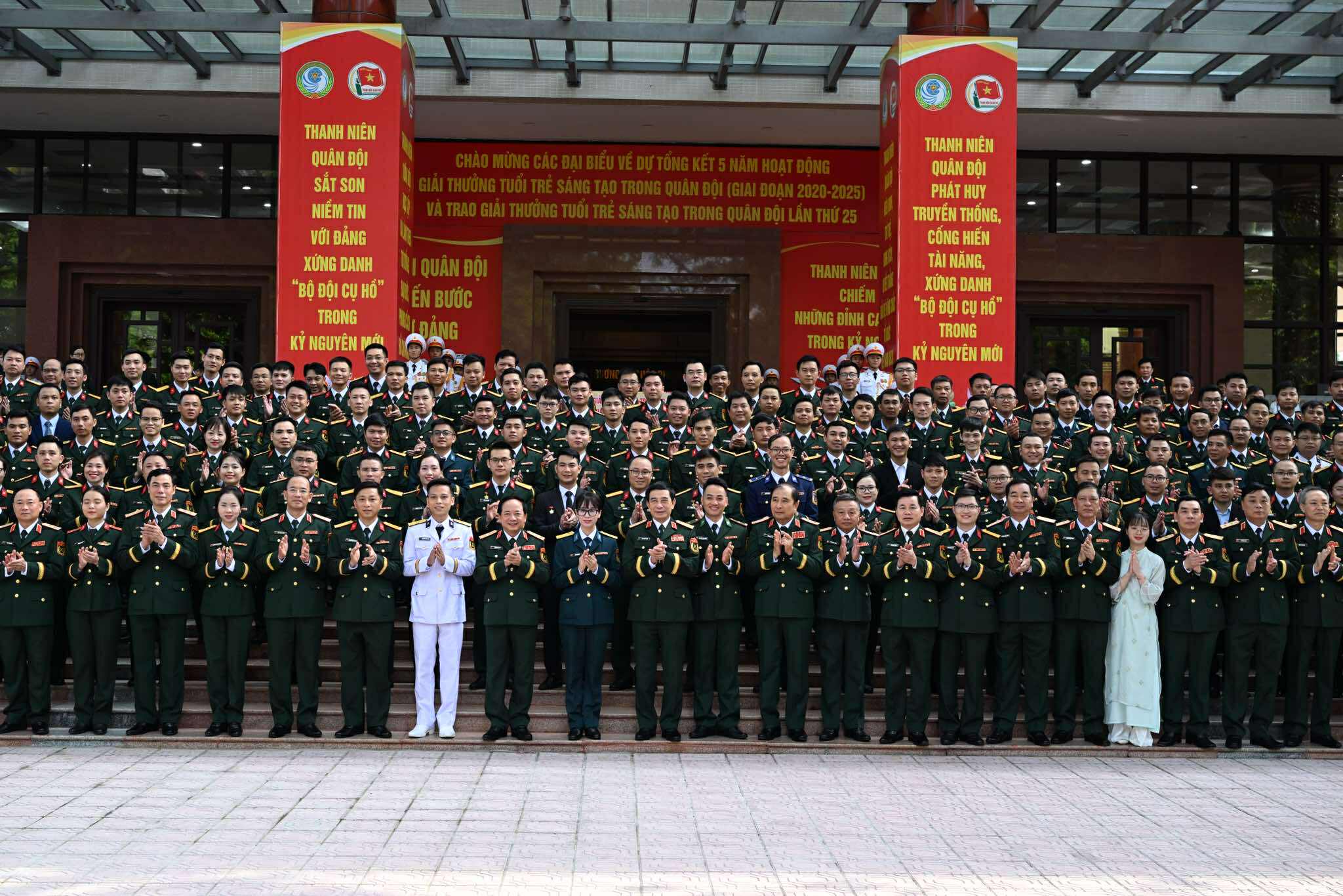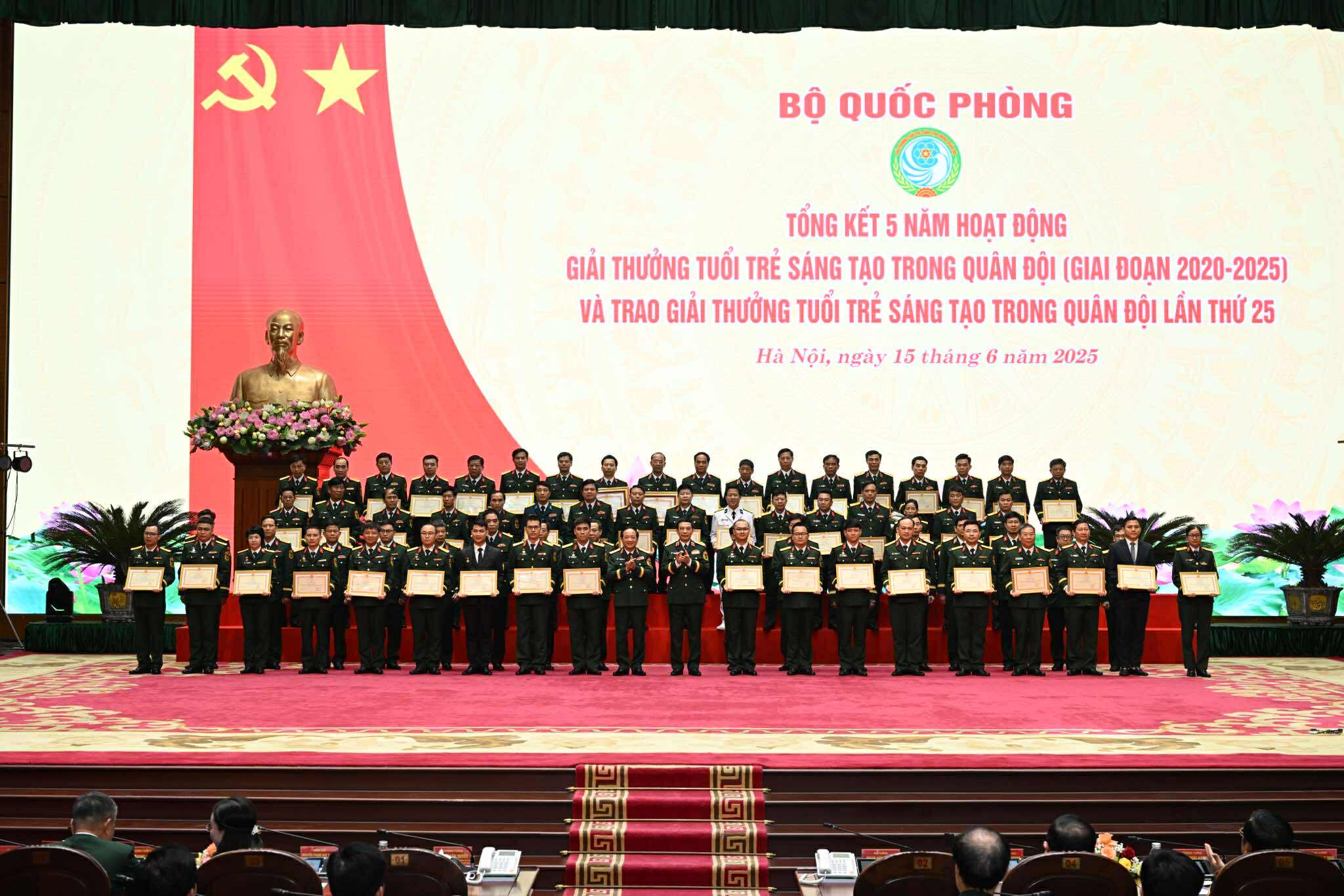 Lãnh đạo Bộ Quốc phòng cùng các đại biểu và tác giả, nhóm tác giả có công trình được trao Giải thưởng Tuổi trẻ sáng tạo trong Quân đội lần thứ 25 (Ảnh: Việt Trung).