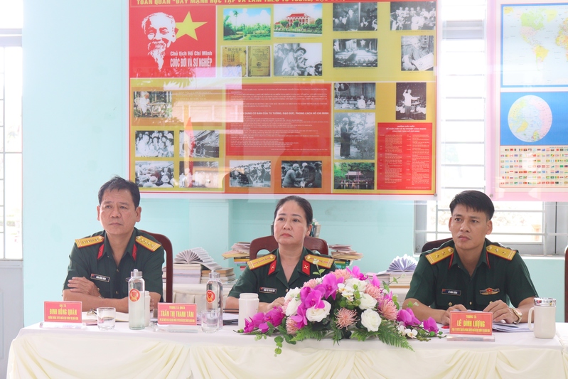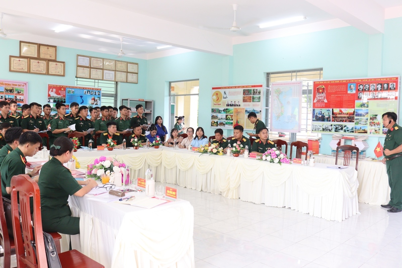 Đại tá Đinh Hồng Quân, Trưởng phòng Tuyên huấn Quân khu (bìa trái) chấm thi tại Tiểu đoàn 47, Bộ Tham mưu Quân khu.