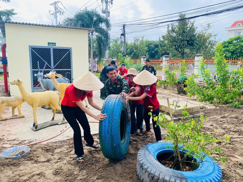 Chiến sĩ Trung đoàn 5 hỗ trợ Trường Mầm non trên địa bàn xã Châu Thành xây dựng cảnh quan.