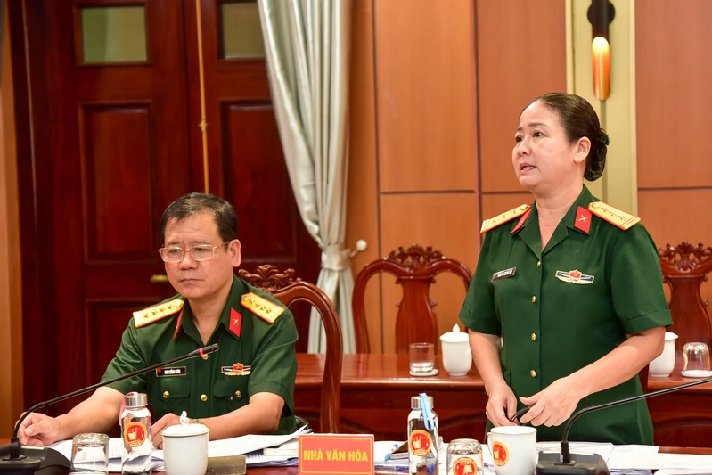 Thượng tá QNCN Trần Thị Thanh Tâm, Phó chủ nhiệm Nhà Văn hóa Quân khu phát biểu đóng góp ý kiến về chất lượng các tác phẩm.