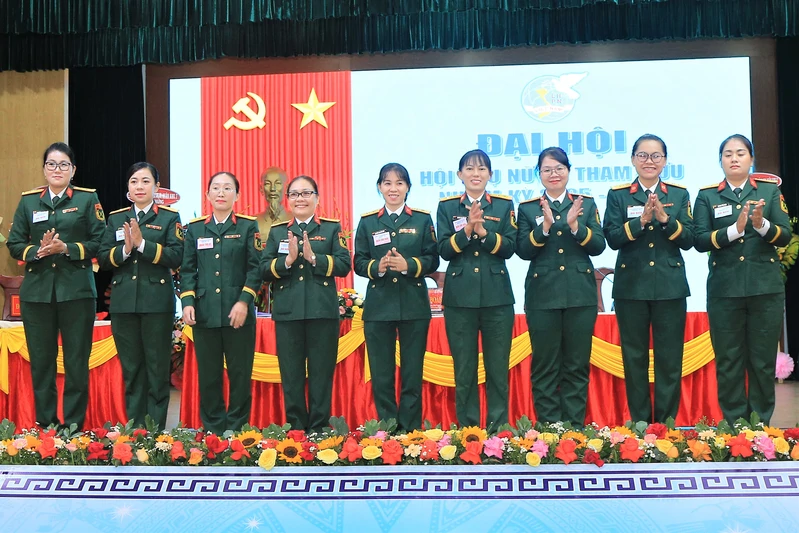 Trung tá Hoàng Thị Thúy Hoa (thứ 4 bên phải) tiếp tục được tín nhiệm bầu giữ chức Chủ tịch Hội Phụ nữ Bộ Tham mưu Quân khu nhiệm kỳ 2025-2030. Ảnh: Nguyễn Hoàng