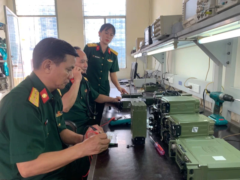 Trung tá Hoàng Thị Thúy Hoa kiểm tra công tác sửa chữa trang bị thông tin tại đơn vị. Ảnh: CTV