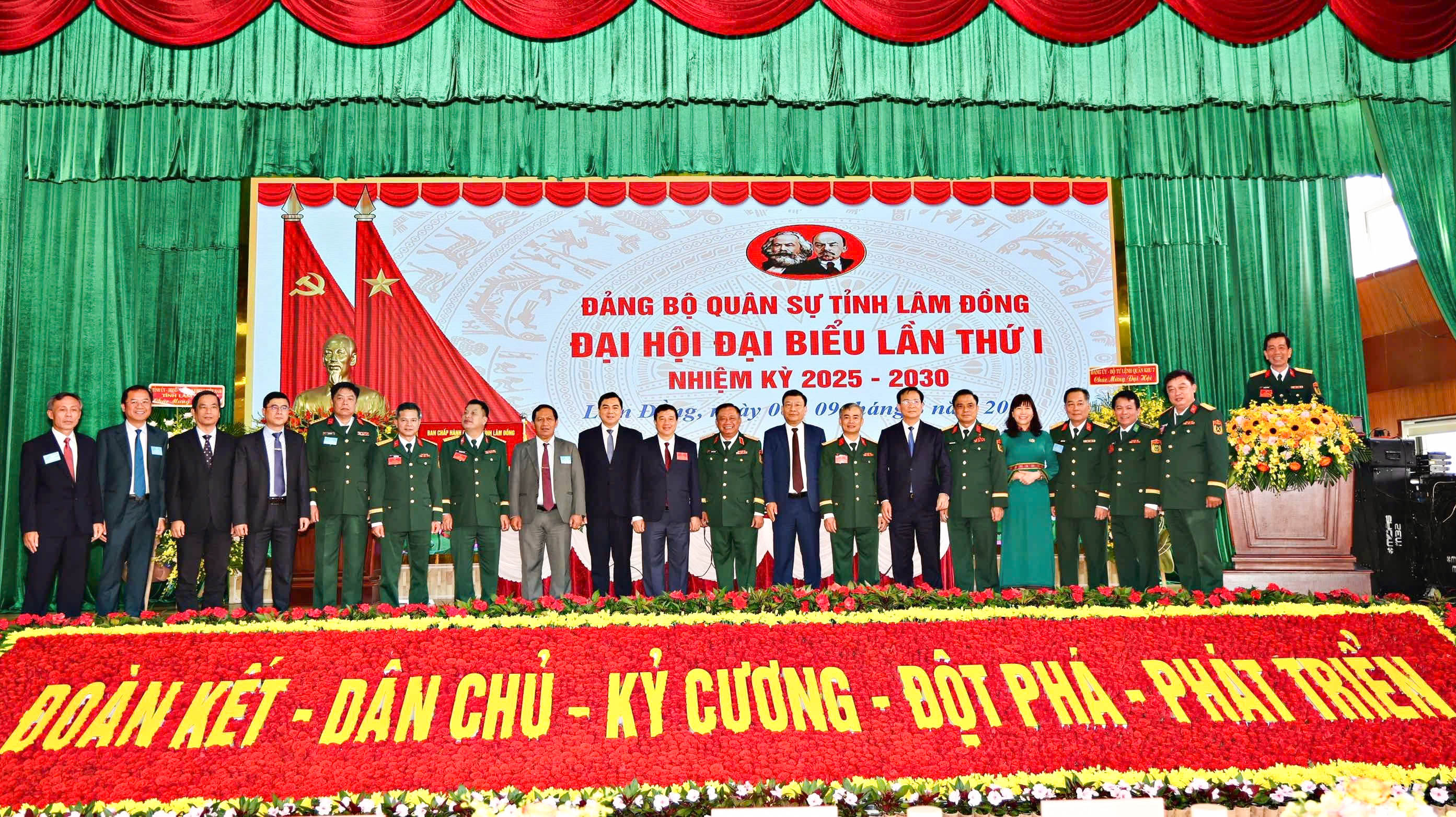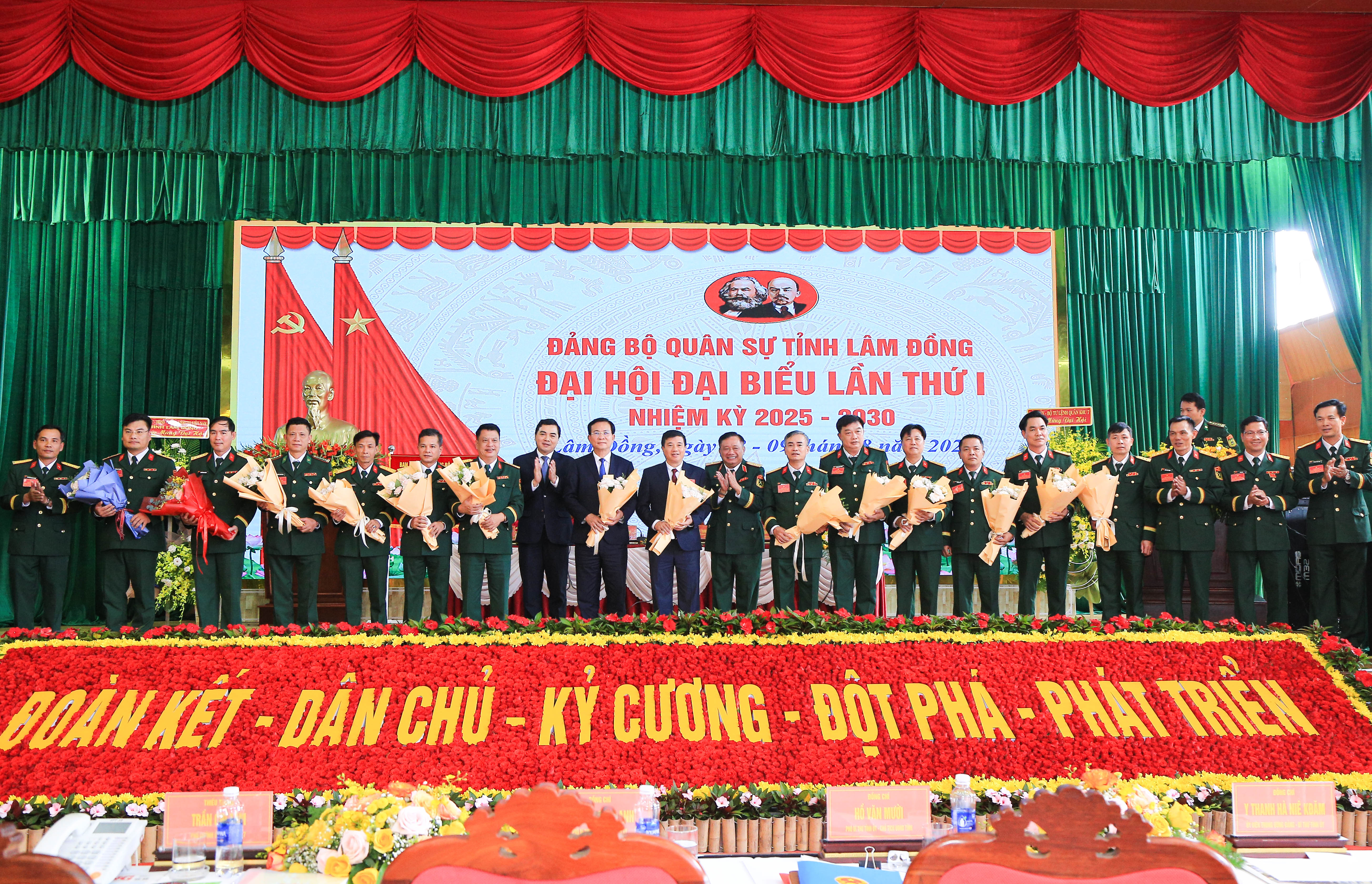 Thiếu tướng Trần Chí Tâm, Ủy viên Ban Thường vụ, Phó Chính ủy Quân khu và đồng chí Nguyễn Hoài Anh, Ủy viên dự khuyết Trung ương Đảng, Phó Bí thư Thường trực Tỉnh ủy Lâm Đồng tặng hoa chúc mừng Ban Chấp hành 123 Win 88ok trang chủ chính thức Quân sự tỉnh nhiệm kỳ 2025 - 2030.